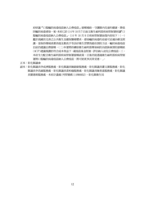 服輪狀病毒疫苗納入公費疫苗』,114 年 10 月 9 日疾病管制署函復內容如下:(一)
