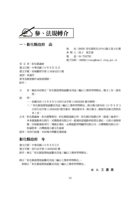 二、「彰化縣遊憩地區觀光用途三輪以上慢車管理辦法」修正條文經本府 114 年 9 月 5