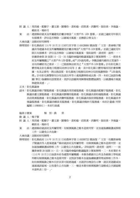 辦理情形:彰化縣政府 114 年 10 月 31 日府農林字第 1140399725 號函復:「主旨:有關貴會楊