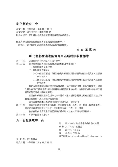 修正「彰化縣彰化漁港能源專用區域碼頭收費標準」。